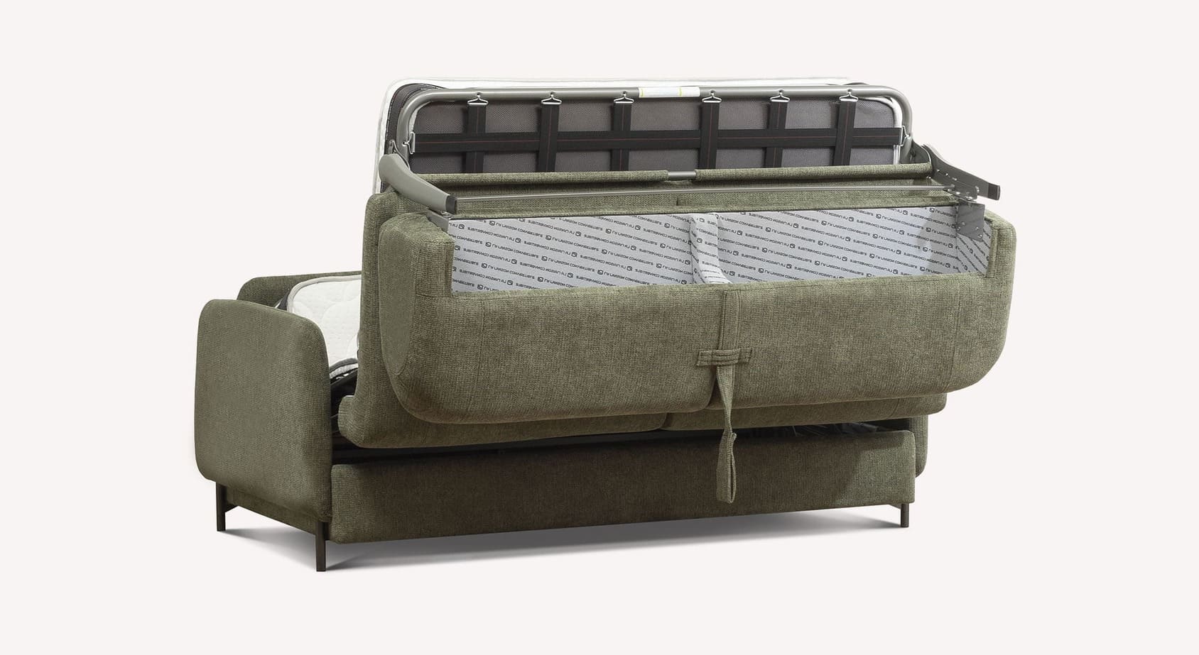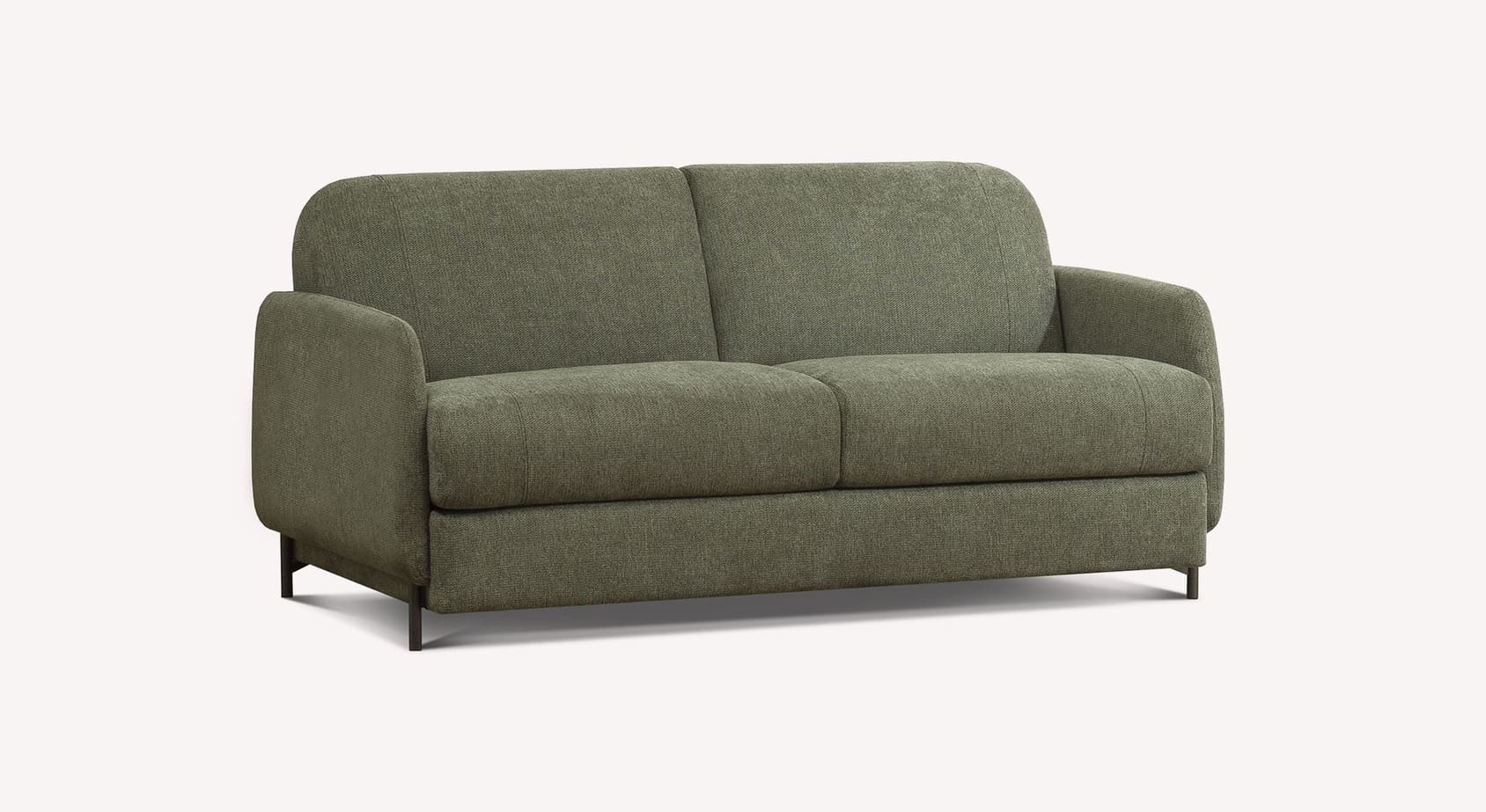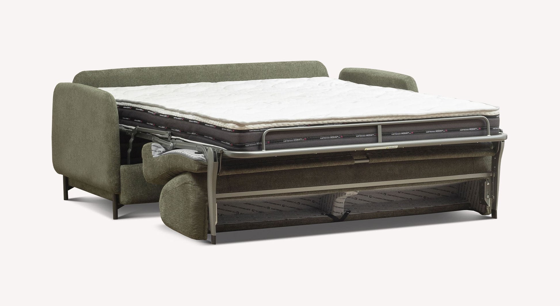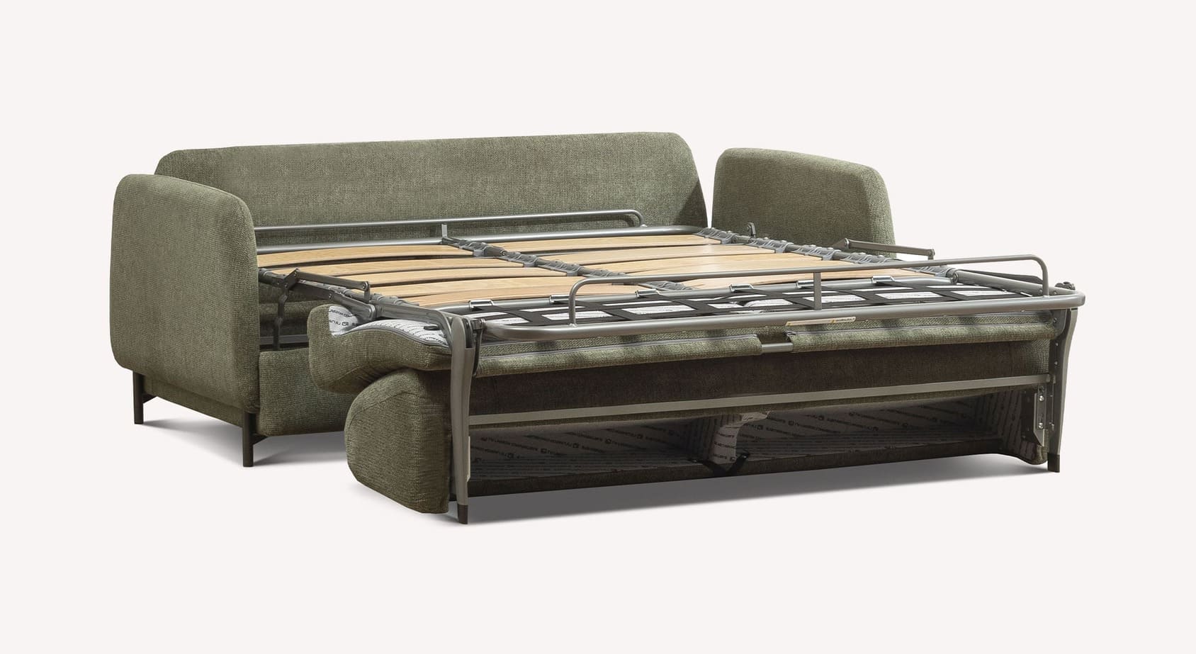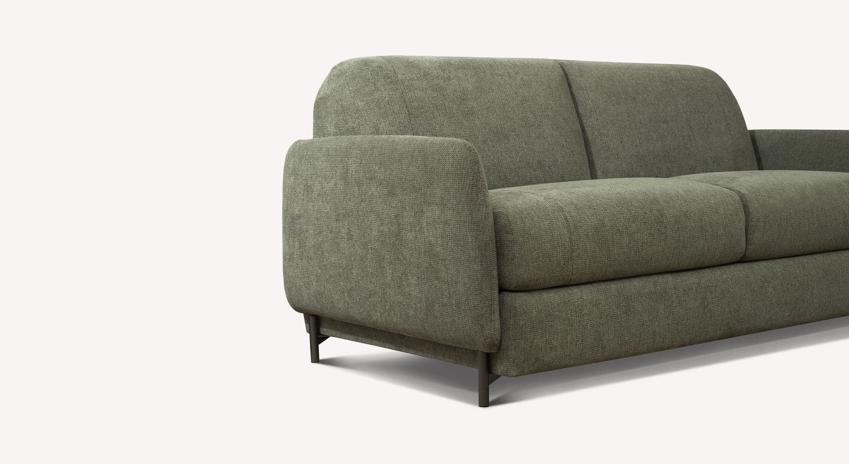 The ECHO sofa bed stands out for its youthful and innovative design, capable of refreshing the aesthetics of the sofa bed with a touch of modernity. The slightly raised armrests reveal the shell around the entire perimeter, giving the product a sense of lightness and originality. The soft shapes of the backrest and seat appear to rest delicately on a solid base, creating an elegant floating effect.