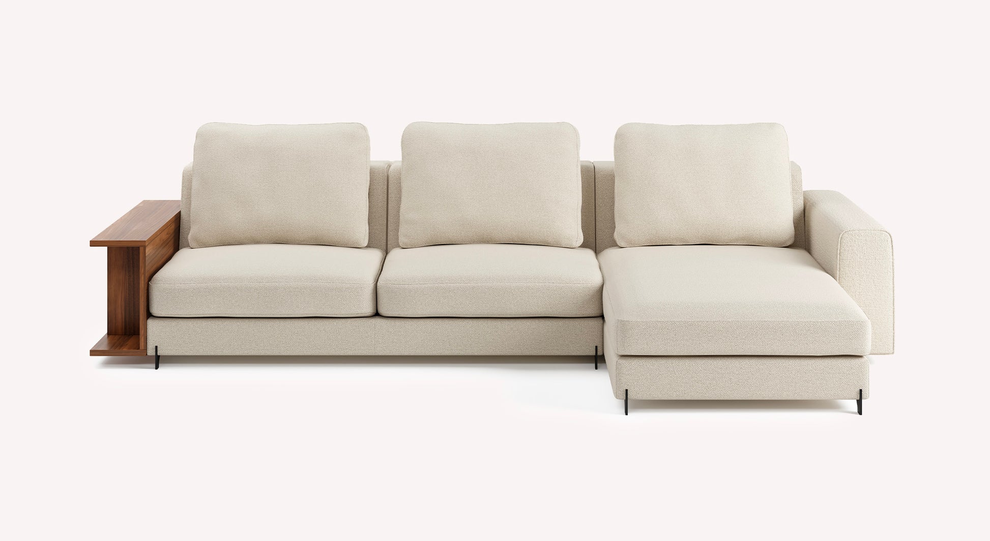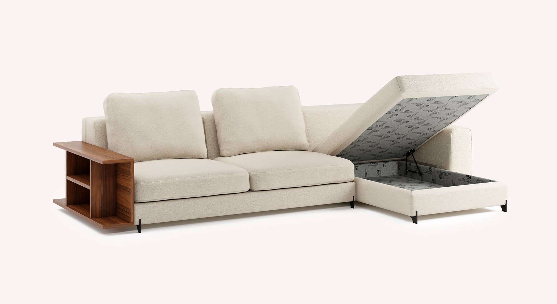The NELLY is the first modular & convertible sofa. Functional and elegant, its minimalist silhouette meets the requirements of design and comfort. Here, dive into its version with lounge chair for fans of TV sets. New: its bookcase armrest offers you a touch of originality and additional storage (in addition to its integrated chest). To compose and modulate endlessly around multiple modules!