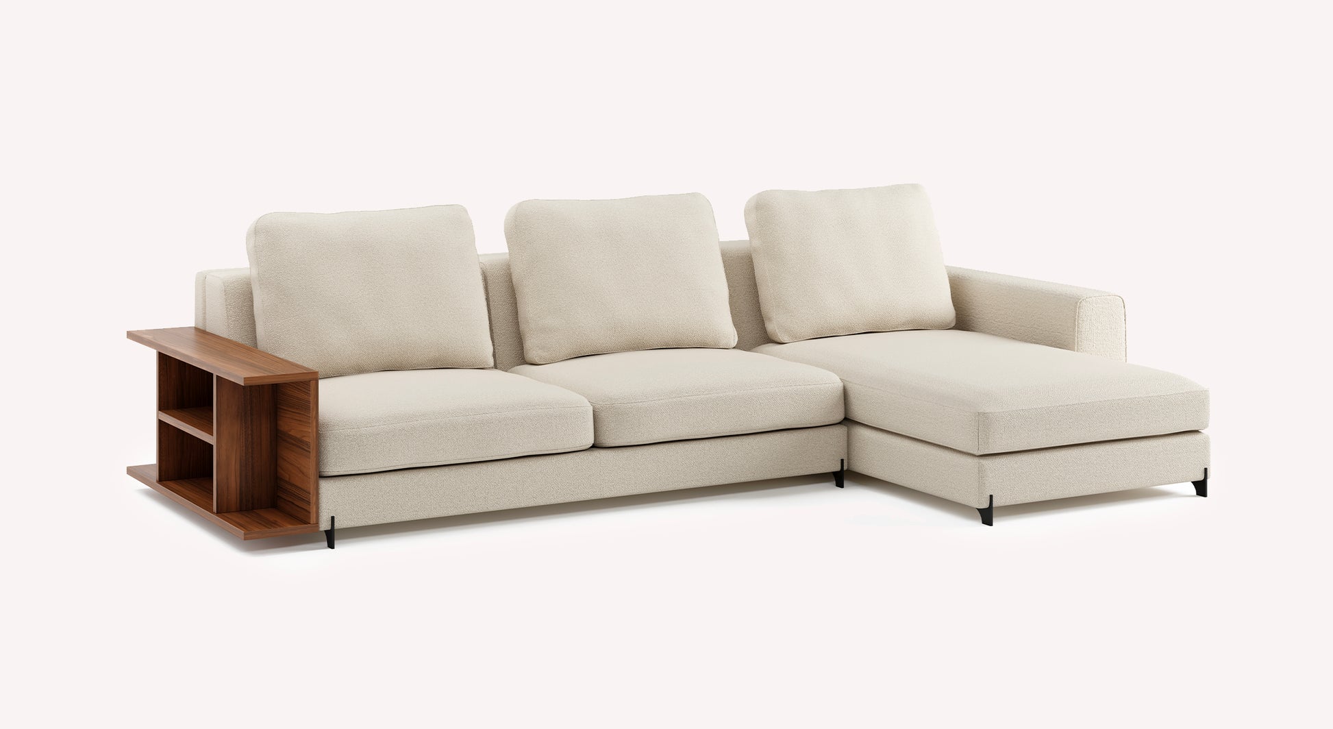 Opt for the NELLY Angle Chest with bookcase armrest, 100% modular and customizable in more than 500 fabrics & leathers to discover in store. Its bookcase armrest, here in walnut, also exists in light oak, gree melamine and black melamine versions.
